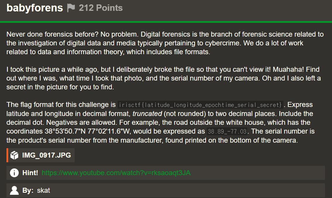 이번 문제는 깨진 사진파일을 하나 주는데 복구하고, 위도 경도를 10진수로 바꾸고, 사진 찍은 시간을 epochtime으로 바꾼다. 이후 카메라 serial number를 찾고, 사진 속 secret 메시지를 찾으면 된다.