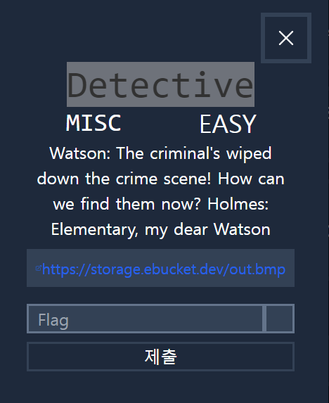 bmp 파일을 하나 주고 푸는 문제였고 위에 있던 이미지 포렌식 사이트에서 flag를 찾았다.
