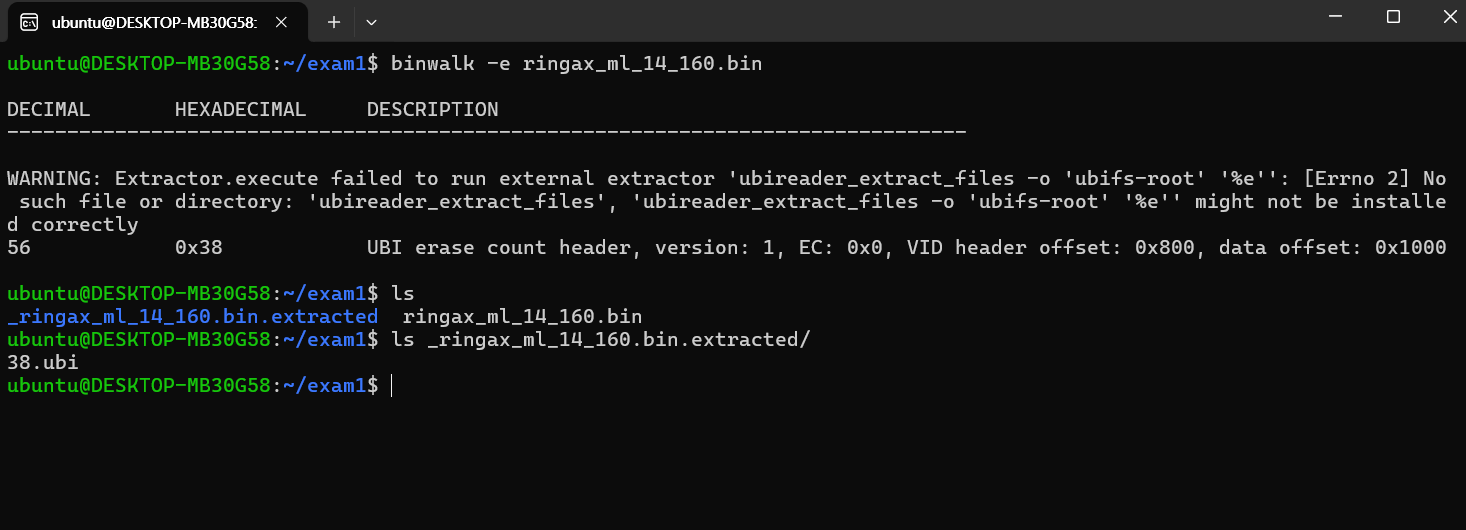 아래 사진처럼 -e 옵션을 했을 때, 폴더하나가 생성되며 안에 ubi파일이 보입니다. 이런 경우 ubi 파일로 압축된 형식이거나 binwalk에서 내부의 압축된 데이터를 자동으로 추출하지 못한 경우일수도 있습니다.