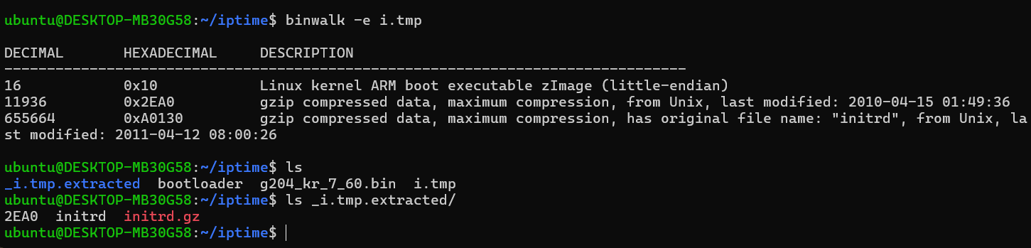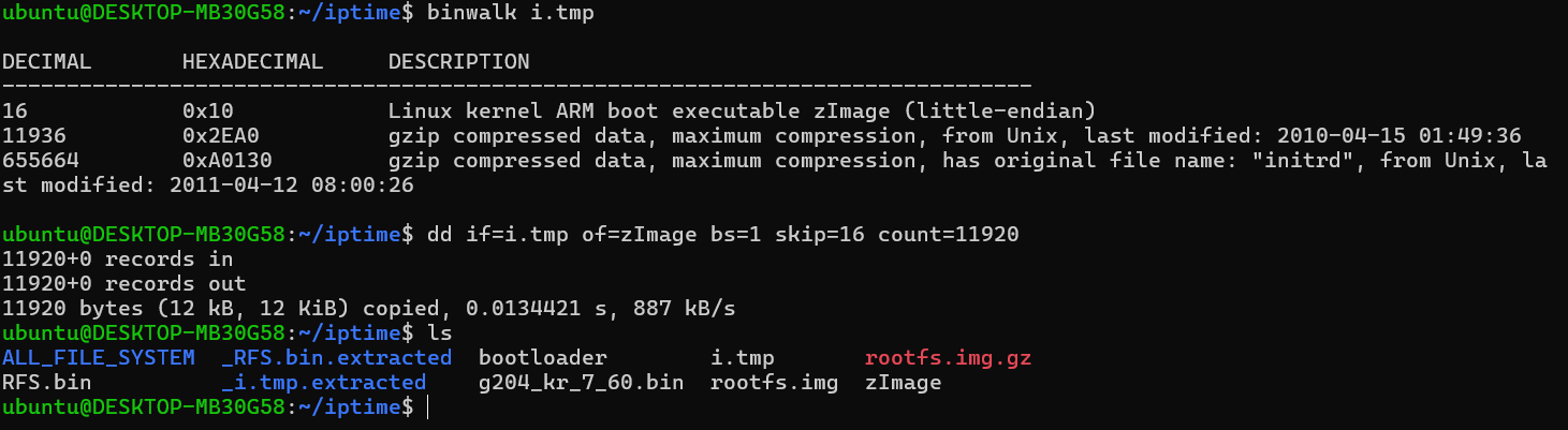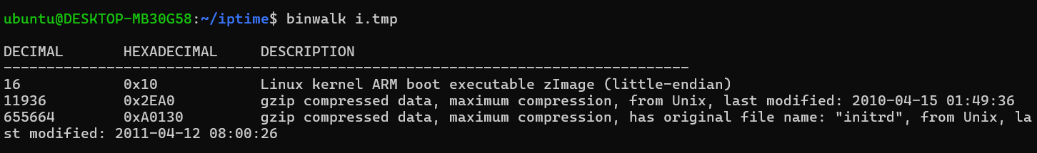 binwalk로 i.tmp를 확인했을 때, 리눅스 커널인 zImage와 두 개의 gzip 파일이 보인다.