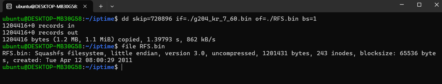 RFS.bin 파일을 잘라서 확인한 결과, Squashfs filesystem으로 나온다.