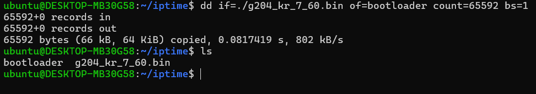 2) dd if=./g204_kr_7_60.bin of=bootloader count=65592 bs=1