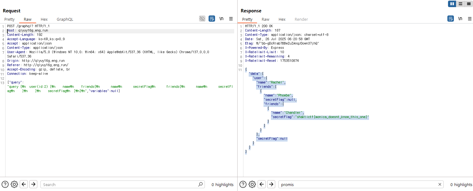 대신 문제에서 secretFlag를 찾으라고 해서 요청 시 에러가 아닌 null이 나왔기에, 컬럼이 존재하는 것을 확인.