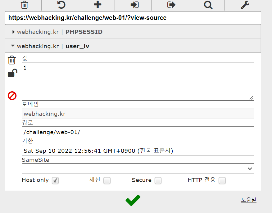예상했던 것처럼 user_lv이라는 쿠키가 존재하고 기본값은 1로 설정되어 있다. 이를 4보다 작고 3보다 큰 수로 설정하면 해결된다. 따라서 3.5로 쿠키를 변조했다.