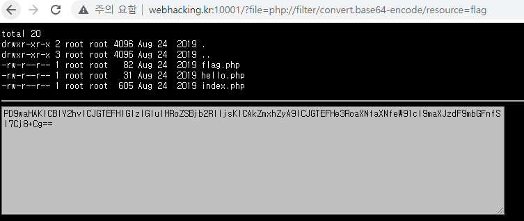 php wrraper 내용은 위 링크에 있으니 확인해보길 바란다. 똑같이 filter를 사용해서 base64로 인코딩했고 resource로 우리가 봐야 할 flag 파일을 넣었다.