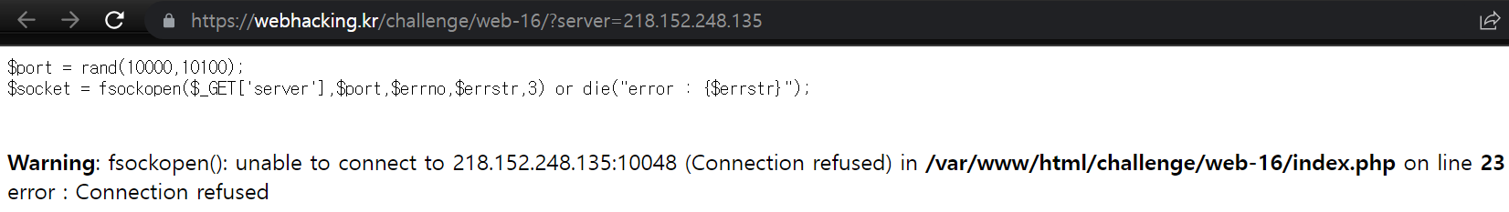문제를 들어가면 위와 같이 출력된다. 적혀 있는 코드를 보면, 먼저 port는 10000~10100 사이에서 랜덤 값으로 port를