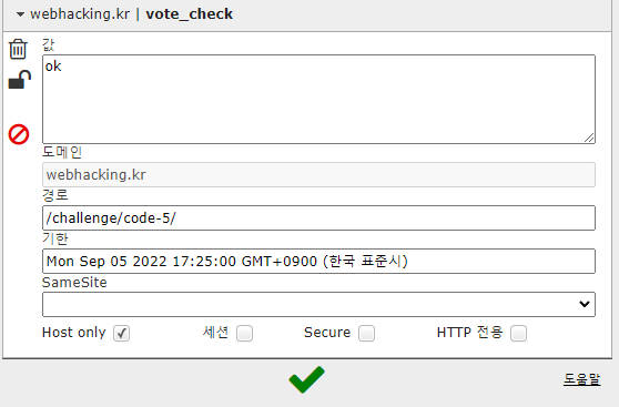 vote_check라는 쿠키가 있다. 이걸로 투표를 확인하고 있을 것이라는 생각이 든다. 그래서 쿠키 값을 0으로 변조하고