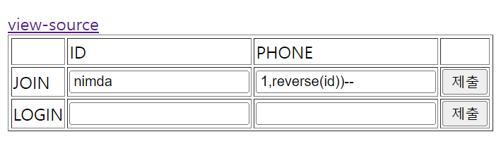 이런 식으로 주는 것이다. 하지만 admin이 필터링이 되고 있어서 제대로 작동하지 않는다. 진짜 갖가지 SQL Injection 쿼리를 넣었는데 잘 안됐다. 그래서 마지막으로 내장 함수를 찾는 중에 reverse() 함수가 존재한다는 것을 알게 되었다. 혹시 해서 넣었다.